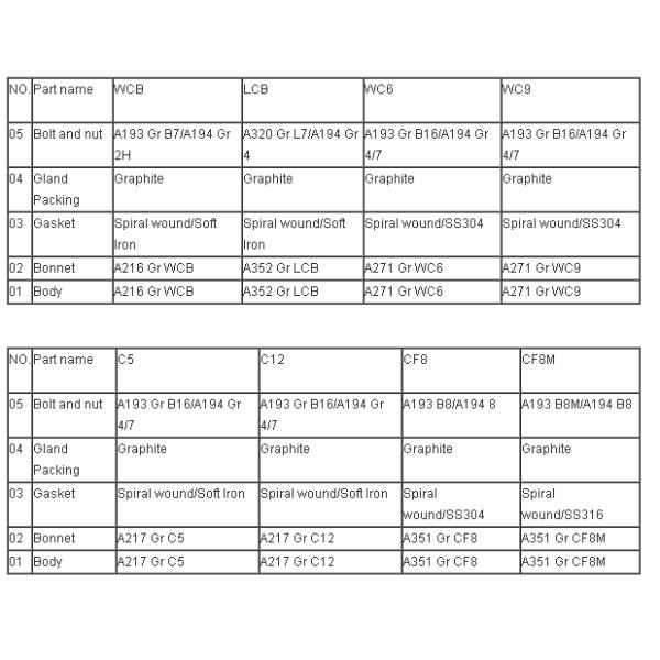 ASTM A216 WCB, A217 WC6, A351 CF8, A351 CF8M,